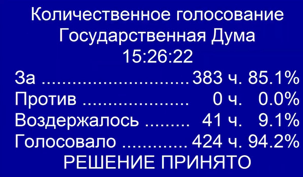 «За» проголосовали 383 депутата, против не высказался никто, воздержался 41 депутат.