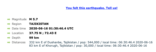 Жители Ташкента и ряда других городов Узбекистана ощущали небольшие подземные толчки. По уточненным данным, эпицентр землетрясения находился на территории Таджикистана на глубине 100 километров. Магнитуда подземных толчков в эпицентре составила 5,9.
