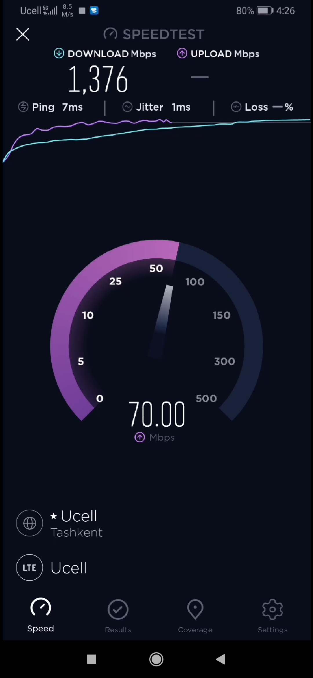 Максимальная зарегистрированная скорость, полученная в реальных условиях, равнялась около 1 Гбит/c. Замеры, осуществлённые при помощи сервиса SpeedTest, показали скорость скачивания до 1 376 Мбит/c.