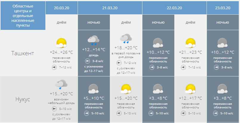 В Каракалпакстане и Хорезмской области также переменная облачность, без осадков. Температура ночью составит +5…+10 градусов, днем +15…+20 градусов.