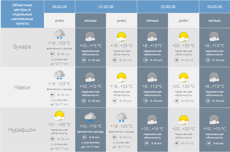 В Бухарской и Навоийской областях переменная облачность, без осадков. Температура ночью +10…+15 градусов, днем +18…+23 градуса.