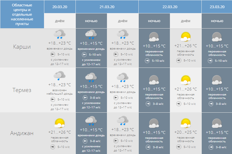 В Кашкадарьинской и Сурхандарьинской областях также переменная облачность, местами дождь. Температура ночью +10…+15 градусов, днем +20…+25 градусов.