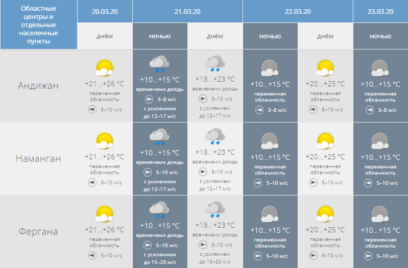 В Андижанской, Наманганской и Ферганской областях ожидается переменная облачность, местами дождь. Температура ночью +10…+15 градусов, днем +18…+23 градуса.