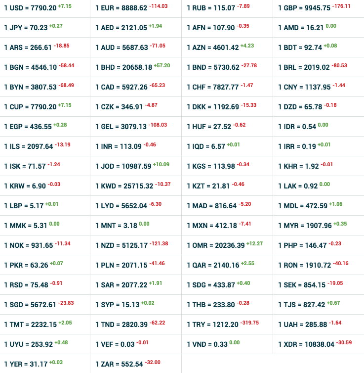 ЦБ Узбекистана обновил курсы иностранных валют по отношению к суму, действительные с 14 августа. По сравнению с прошлой неделей, доллар показал рост на 7.15 сумов до 7790.20, а евро потерял в цене 114.93 сума до отметки в 8888.62 сума. Рубль также потерял почти 8 сумов до отметки в 115.07 сумов.