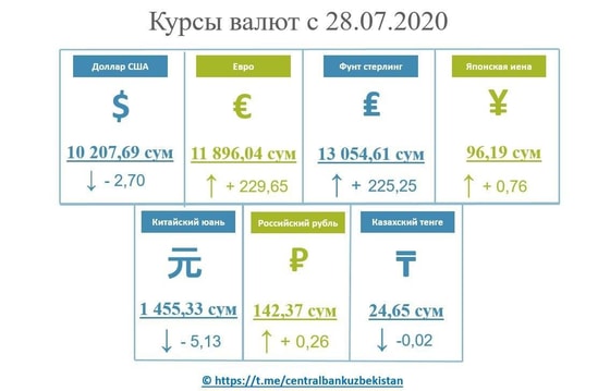 Центральный банк Узбекистана установил новые курсы иностранных валют по отношению к суму. Курс доллара составил 10 207,69 сумов (-2,7), а евро – 11 896,04 сумов (+229,65).
