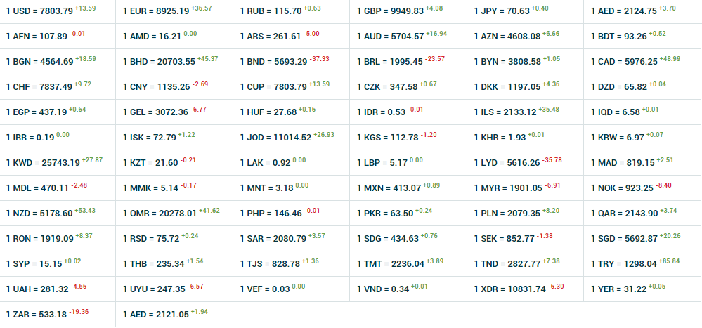 Центральный банк Узбекистана сообщает о том, что с 21 августа новый курс доллара по сравнению с предыдущей неделей подорожал на 13,59 сумов и равен 7803,79 сумов.