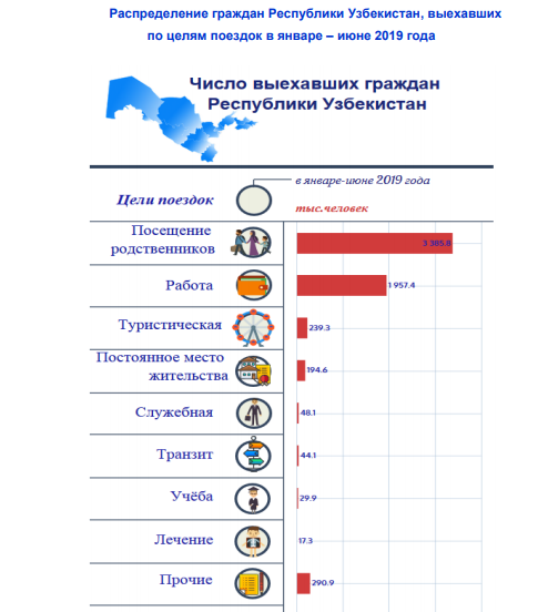 Граждане Узбекистана, выехавшие за рубеж достигли количества 6207,4 тысяч человек. По сравнению с январем-июнем 2018 года, этот показатель снизился на 11,3%, сообщает Госкомстат.