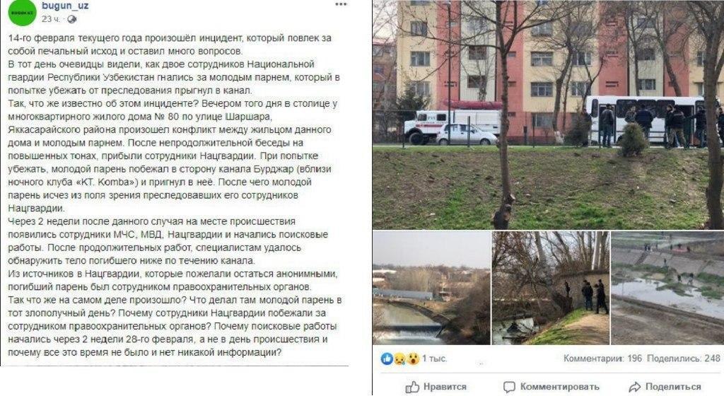 14 февраля в Facebook было распространено сообщение о том, что нацгвардейцы преследовали предположительно одного сотрудника правоохранительных органов по улице Шаршара. После чего сотрудник ОВД бросился в канал Бурижар. Спустя две недели был найден его труп, сообщает пресс-служба Генпрокуратуры.