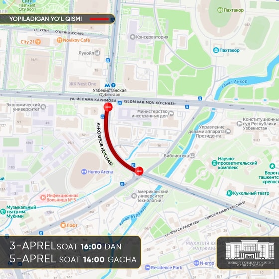 В связи с проведением чемпионата Узбекистана по дуатлону, а также мероприятий International Tashkent Marathon – 2026, следующие улицы временно перекроют:
