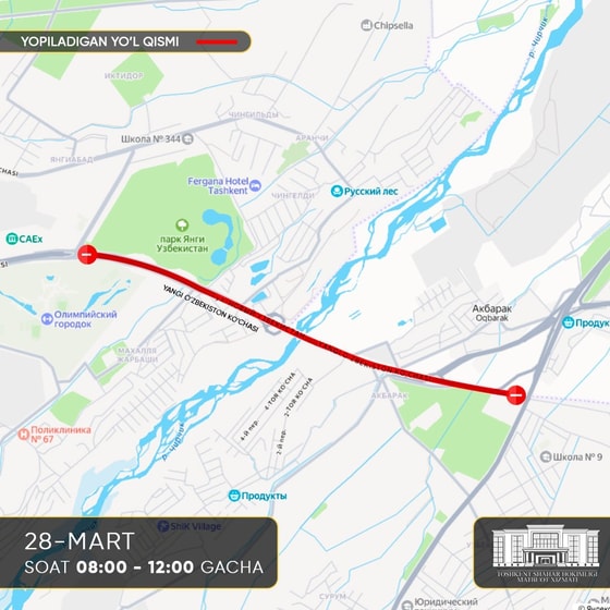 • улица Янги Узбекистон — от участка напротив университета CAU до Паркентской автомагистрали.