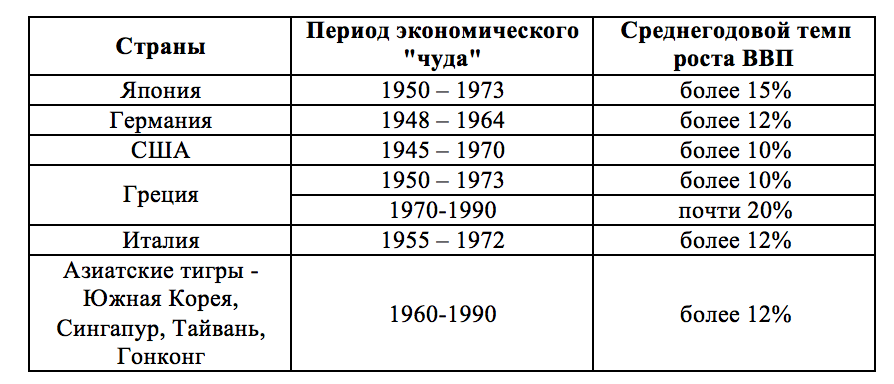 «Экономическое чудо» относится не только к азиатским, но и к многим европейским странам, чьи экономики устойчиво росли в среднем не менее 10% в год (некоторые 70% в год в течении 1-2 лет!) в течении 20-30 лет во второй половине прошлого века(см. Таблицу).