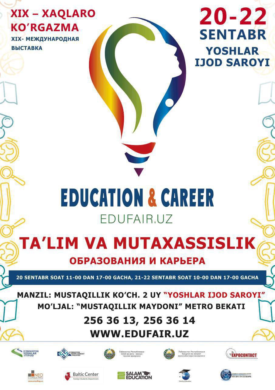 20-22 сентября текущего года в «Молодежном творческом дворце» пройдет XIX Международная выставка «Образование и карьера», традиционно организованная в целях ознакомления молодежи с профессиональными и специализированными направлениями, существующими в передовых высших учебных заведениях нашей страны и всего мира, помощи молодежи при выборе профессии, ознакомления молодежи со всеми созданными правительствами условиями, уведомления молодежи о свободных рабочих местах, а также помощи в обеспечении работой.