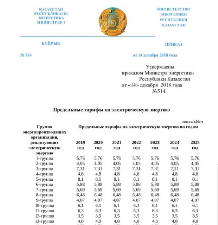 С 1 января 2019 года тарифы на электричество в Казахстане снизились (!) до 18%.