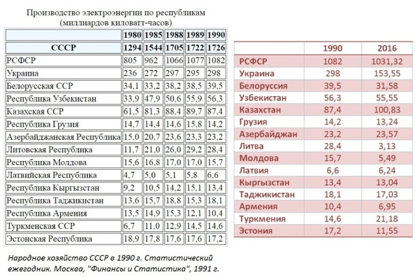 Из приведенной таблицы видно, что лидером среди стран бывшего СССР является Казахстан (производство электроэнергии в 2016 году достигло 100,8 млрд кВт-часа, что на 15,4% выше уровня 1990 года). У большинства бывших советских республик наблюдается снижение энергопроизводства. Однозначно расценивать этот факт, как негативный, не стоит. За это время отпала необходимость (объективная или субъективная – это другой вопрос) во многих производствах, оставшиеся - модернизировали и оснастили современными энергосберегающими станками и технологиями.
