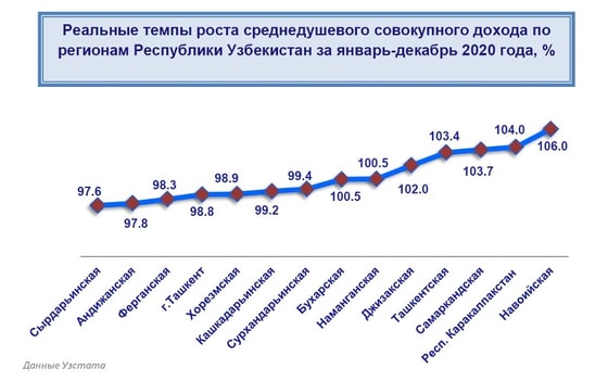 За 2020 год – по данным Узстата – совокупный доход на душу населения составил 11,7 млн сумов. При этом реальные темпы роста среднедушевого совокупного дохода за прошлый год практически не выросли (прирост составил всего 0,7 %).