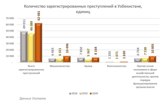 29 марта в Ташкенте состоялось заседание национального совета по противодействию коррупции. Были озвучены данные, что 89,4 % преступлений, связанных с коррупцией, было совершено чиновниками районного и городского уровня; 9,2 % - областного уровня и 1,4 % - республиканского уровня. В 2020 году суды рассмотрели 1 502 уголовных дела о коррупции в отношении 2 270 лиц.
