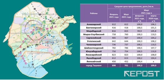 В марте 2021 года в Ташкенте наблюдалось разнонаправленное движение цен предложения по районам. Наибольший прирост за месяц показала СЦП в Бектемирском, Шайхонтохурском и Юнусабадском районах – по 0,5 %. Снижение СЦП за март наблюдалось в Мирабадском районе (на 0,1 %).