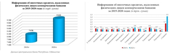По сообщению Центрального банка, объёмы ипотечного кредитования в Узбекистане в 2020 году увеличились на 20 % по сравнению с 2019 годом. За 2020 год коммерческими банками были выделены ипотечные кредиты 77 274 физическим лицам в размере 9,1 трлн сумов, что на 1,1 трлн сумов больше, чем за 2019 год.