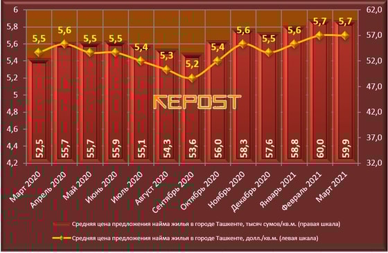 - Средняя стоимость найма квартир в марте 2021 года в Ташкенте сохранилась на уровне февраля 2021 года (5,7 доллара/кв. м). В национальной валюте стоимость найма квартир незначительно уменьшилась по сравнению с февралём 2021 года на 0,3 % и составила 59,9 тысячи сумов/кв. м.
