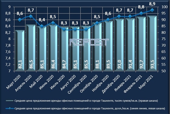 - Средняя стоимость аренды офисов в марте 2021 года в столице выросла на 1,1 % - до уровня 8,9 доллара/кв. м. В сумовом выражении размер аренды за март 2021 года увеличился на 0,9 % и составил 93,5 тысячи сумов/кв. м.