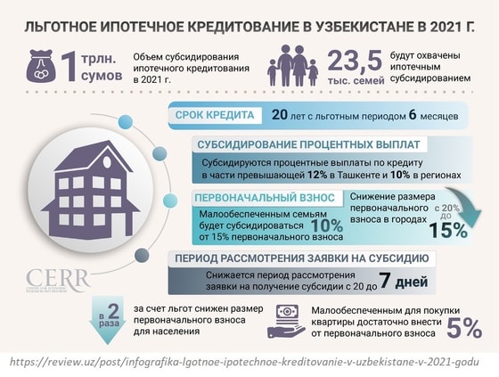- в городах (в том числе городе Ташкенте) — на компенсацию расходов, связанных с оплатой части первоначального взноса в размере 10 процентов от расчётной стоимости жилья;