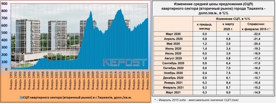 В марте 2021 года средняя цена предложения (СЦП) жилой недвижимости (квартирный сектор, вторичный рынок) города Ташкента составила 701 доллар/кв. м. Это на 0,3 % выше уровня аналогичного показателя предыдущего месяца (в феврале 2021 года прирост составил также 0,3 %).