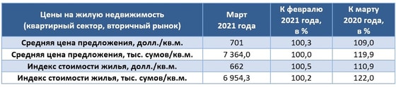 Индекс стоимости жилья (средняя цена предложения, скорректированная на усреднённый размер дисконта или скидки при совершении сделок между продавцами и покупателями квартир) в марте 2021 года по сравнению с уровнем предыдущего месяца вырос в долларовом выражении на 0,5 % до значения 662 доллара/кв. м, а в сумовом, соответственно, на 0,2 % и 6 954,3 тысячи сумов/кв. м.