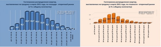 Почти 56 % квартир, выставленных на продажу в марте 2021 года, имели общую площадь от 40 до 79 квадратных метров. Это средняя площадь типовых двух- и трёхкомнатных квартир. Именно этот сегмент занимает более 51 % квартирного рынка с ценами продаж 20-49 тысяч долларов: 11,1 % занимают квартиры с ценами предложения от 20 до 30 тысяч долларов; 18,9 % - с ценами предложения 30-39 тысяч долларов и 21,4 % - от 40 до 50 тысяч долларов.