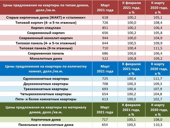 В марте 2021 года цены на квартиры, расположенные в старых кирпичных домах, скорректировались в сторону повышения на 0,2 % (618 долларов/кв. м). В 4-х и 5-ти этажных кирпичных домах типовой планировки СЦП цена сохранилась на уровне февраля 2021 года (726 долларов/кв. м).