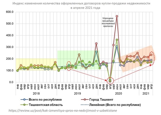 Так, 18 июня 2020 года в пресс-службе министерства юстиции республики сообщили, что жители Узбекистана купили 12 799 квартир в Ташкенте с апреля 2020 года. Около 70 % сделок было оформлено жителями не из Ташкента. Можно предположить, что такой «бум» произошёл из-за того, что с 1 апреля 2020 года был отменен запрет на покупку жилья в Ташкенте и Ташкентской области жителями других регионов страны. Но на самом деле – в большинстве случаев – имело место переоформление ташкентских квартир на реальных собственников (лиц, на средства которых было приобретено жилье, оформленное затем на другое лицо, имеющее ташкентскую прописку).