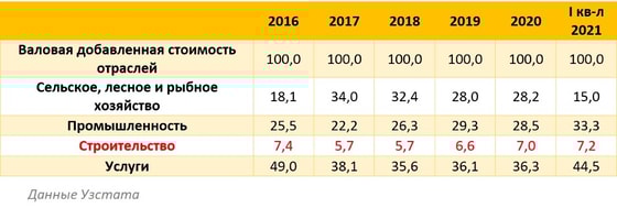 В сообщении Узстата отмечается: «Несмотря на увеличение объёмов строительных работ на 0,5 % по сравнению с январём-мартом 2020 года это почти не оказало влияния на рост ВВП (в январе-марте 2020 года – 0,5 процентных пункта).