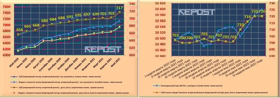В мае 2021 года цены на квартиры, расположенные в старых кирпичных домах, скорректировались в сторону повышения на 1,9 % (629 долларов/кв. м). В 4-х и 5-ти этажных кирпичных домах типовой планировки СЦП достигла уровня 745 долларов/кв. м, что на 2,5 % превышает соответствующий показатель предыдущего месяца.
