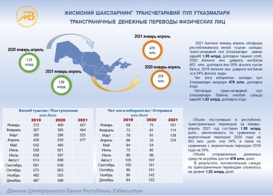 Центральный банк Узбекистана проинформировал о международных трансграничных денежных переводах физических лиц, поступивших в республику в январе-апреле 2021 года. Отмечается, что объём международных трансграничных денежных переводов, поступивших в республику, за январь-апрель 2021 год составил 1,99 млрд долларов, увеличившись по сравнению с аналогичным периодом 2020 года на 663 млн долларов или почти на 50 %, а по сравнению с аналогичным периодом 2019 года – на 33,5 %.