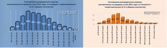 Около 53 % квартир, выставленных на продажу в мае 2021 года, имели общую площадь от 40 до 79 квадратных метров. Это средняя площадь типовых двух- и трёхкомнатных квартир. Именно этот сегмент занимает 52,4 % квартирного рынка с ценами продаж 20-49 тысяч долларов: 11,1 % занимают квартиры с ценами предложения от 20 до 30 тысяч долларов; 19,2 % – с ценами предложения 30-39 тысяч долларов и 22,1 % – от 40 до 50 тысяч долларов.
