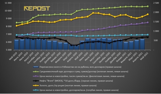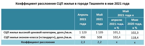 Индекс стоимости жилья (средняя цена предложения, скорректированная на усреднённый размер дисконта или скидки при совершении сделок между продавцами и покупателями квартир) в мае 2021 года по сравнению с уровнем предыдущего месяца вырос в долларовом выражении на 2,0 % до значения 677 долларов/кв. м, а в сумовом, соответственно, на 2,4 % и 7 143,2 тысячи сумов/кв. м.