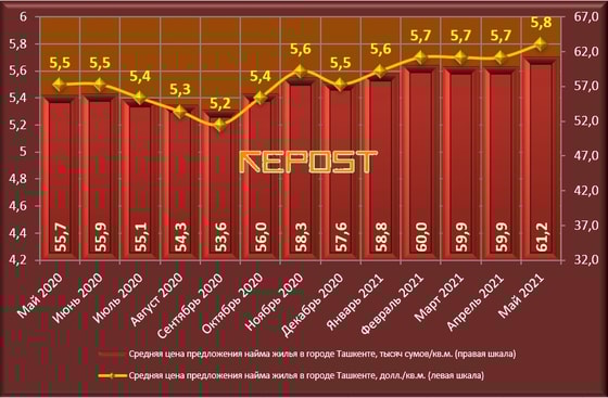 - Средняя стоимость найма квартир в мае 2021 года в Ташкенте возросла до уровня 5,8 доллара/кв. м). В национальной валюте стоимость найма квартир также увеличилась и составила 61,2 тысячи сумов/кв. м.