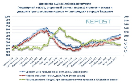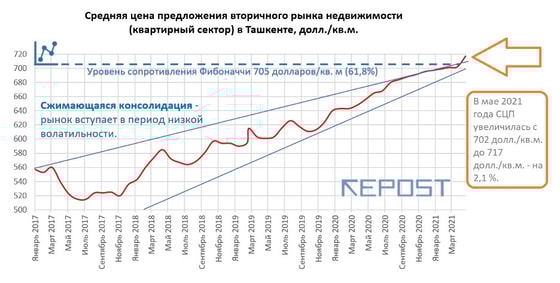 В мае 2021 года средняя цена предложения (СЦП) жилой недвижимости (квартирный сектор, вторичный рынок) города Ташкента составила 717 долларов/кв. м. Это на 2,1 % выше уровня аналогичного показателя предыдущего месяца (в апреле 2021 года прирост составил 0,1 %).