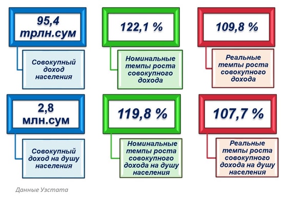 Согласно предварительным данным Узстата, в январе-марте 2021 года общий объем совокупного дохода населения страны достиг 95,4 трлн сумов. При этом темп роста совокупного дохода населения по сравнению с аналогичным периодом 2020 года в реальном выражении составил 109,8 %.