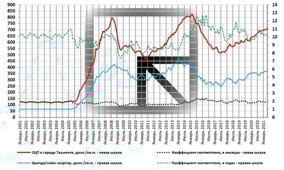 На графике представлены коэффициенты соответствия величин найма и стоимости жилья. Это время (месяцы или годы), необходимое для того, чтобы сумма платы за наём жилья сравнялась с рыночной стоимостью квартиры. В мае 2021 года этот показатель в среднем по Ташкенту составил 124 месяца или 10 лет и 4 месяца.