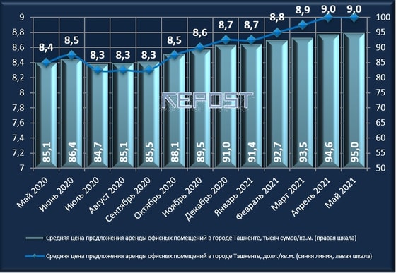 В мае 2021 года средняя цена предложения аренды офисных помещений осталась на уровне предыдущего месяца – 9,0 долларов/кв. м. В национальной валюте стоимость аренды достигла 95,0 тысячи сумов/кв. м, увеличившись за месяц на 0,4 %. По сравнению с маем 2020 года средний размер аренды офисов вырос в долларовом выражении на 7,1 %, а в сумовом – на 11,6 %.