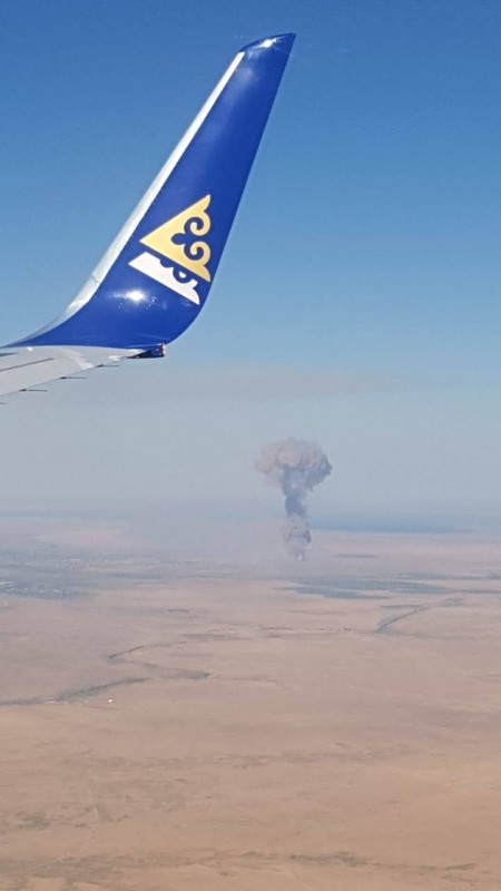 Вид на взрыв на территории воинской части города Арысь с самолета.
