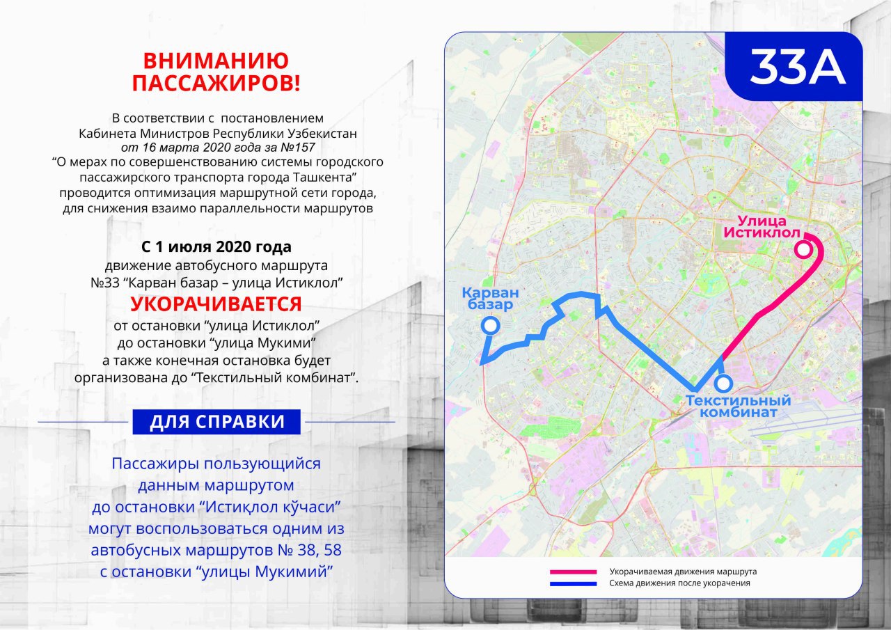 Отмечается, что автобусный маршрут №33 «Карван базар – улица Истиклол» укорачивается до остановки «улица Мукими». Конечная остановка будет организована до «Текстильный комбинат».