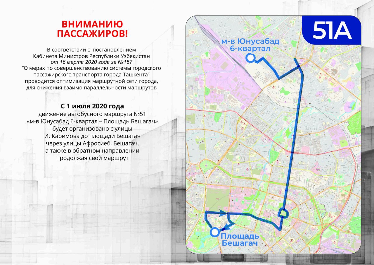 Автобусный маршрут №51 «массив Юнусабад 6-квартал – Площадь Бешагач» будет организовано с улицы Ислама Каримова до улицы Бешагач через улицы Афросиёб, Бешагач, а также в обратном направлении.