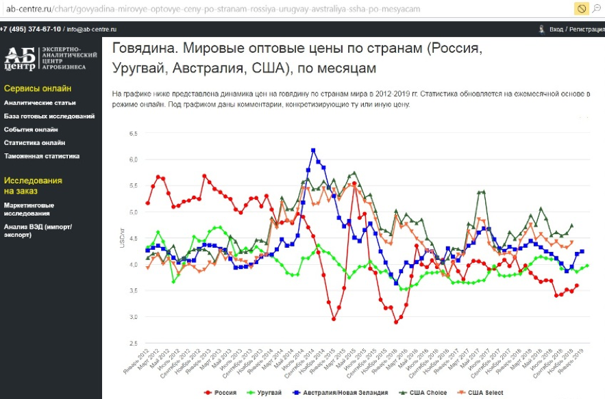 В июле 2019 года средняя розничная цена говядины была в Москве 6,60 доллара за килограмм; в Нур-Султане – 4,78; в Бишкеке – 4,74; в Минске – 4,38 доллара.