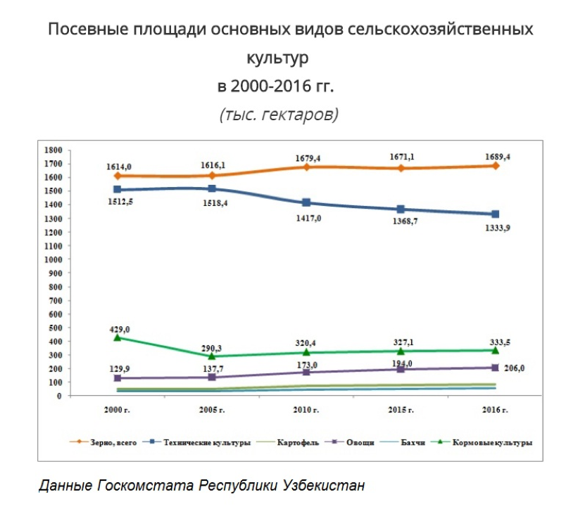 В целом, по республике площади под кормовые культуры сокращаются. Если в 1980 году в Узбекистане под посевы кормовых культур было занято 722,4 тысячи га, в 1985 – 887,6 тысячи, то в 1990 году – 1 039,7 тысячи га. В 2018 году площадь под их посевами уменьшилась до 242,7 тысячи га.