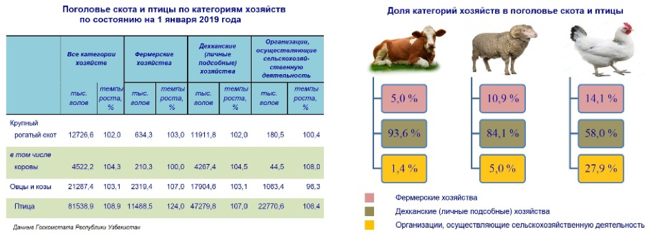 Анализируя данные о поголовье крупного рогатого скота по категориям хозяйств по состоянию на 1 января 2019 года, следует отметить, что 5,0 процентов поголовья крупного рогатого скота приходятся на фермерские хозяйства, 93,6 процента – на дехканские (личные подсобные) хозяйства, 1,4 процента – на организации, осуществляющие сельскохозяйственную деятельность. Соответственно, от общего числа овец и коз на фермерские хозяйства приходятся 10,9 процента, на дехканские (личные подсобные) хозяйства – 84,1 процента, на организации, осуществляющие сельскохозяйственную деятельность, – 5,0 процентов. От общего числа птиц на фермерские хозяйства приходятся 14,1 процента, на дехканские (личные подсобные) хозяйства – 58,0 процентов, на организации, осуществляющие сельскохозяйственную деятельность, – 27,9 процента.