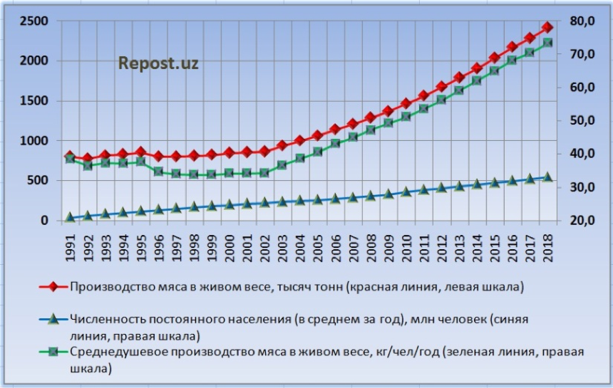 И как при таком уходе можно добиться высоких привесов? Разве можно государству полагаться только на крупный рогатый скот, который содержится в дехканских хозяйствах? Ведь у нас в стране около 76 процентов объема потребляемого мяса составляет говядина. В этом заключается еще одна причина неудовлетворительного обеспечении рынка мясом. Можно, конечно, гражданам посоветовать переходить на мясо птицы, которое производится в достаточном количестве. Но существует традиции и менталитет, которые ограничивают потребление куриного мяса.