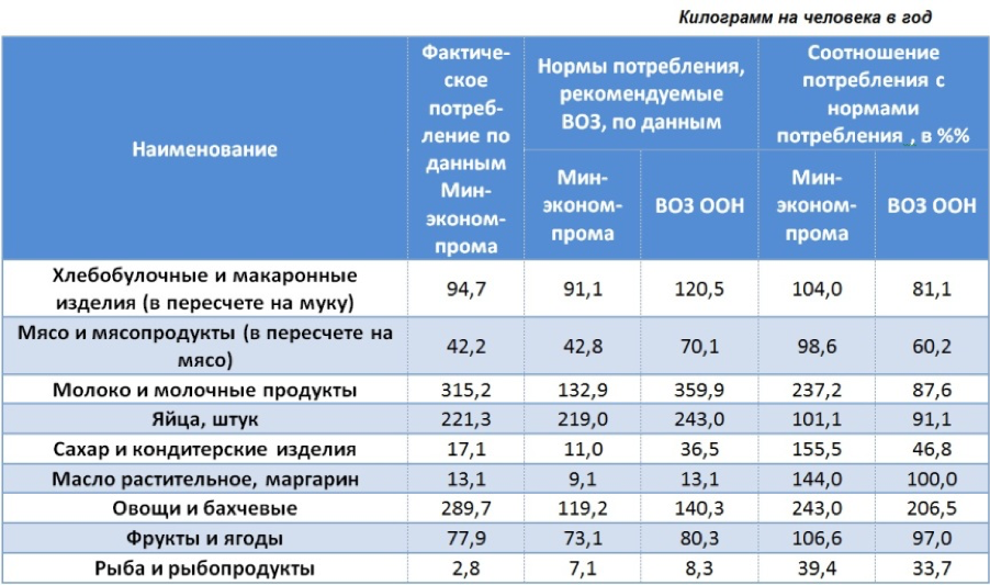 В проекте документа ведомство отмечало, что «перечень продовольственных товаров и среднесуточные минимальные медицинские нормы их потребления не соответствуют уровню сегодняшнего потребления». В приложении к проекту размещались перечень необходимых продовольственных товаров и среднесуточные минимальные медицинские нормы их потребления. Для мужчин в возрасте от 16 до 59 лет и женщин (16 – 54 года) среднесуточные минимальные медицинские нормы потребления говядины составляют 50 грамм в сутки, баранины – 20. По мясу птицы, соответственно, 80 и 60 грамм в сутки. Или для мужчины минимальная медицинская норма потребления мяса составляет 54,8 килограмм в год, для женщины – 47,5.