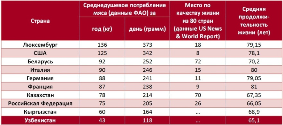 Можно проследить по данным таблицы, что продолжительность жизни в разных странах мира характеризует степень развитости страны, ее благосостояние и уровень системы здравоохранения. Также на среднюю продолжительность жизни влияет образ жизни людей, качество их питания и приверженность к здоровому образу жизни. Качество питания зависит, в немалой степени, от возможности потребления достаточного количества мяса. Вообще, об экономической доступности продовольствия можно судить по уровню потребления мяса в стране, ведь это один из самых дорогих продуктов питания.