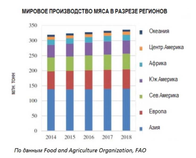 Производство и потребление мяса растет во всем мире. По данным Продовольственной и сельскохозяйственной организации ООН (ФАО) (Food and Agriculture Organization, FAO)мировое производство мяса в 2018 году оценивается в 336,4 млн. тонн, что на 1,2 процента больше, чем в 2017 году. Увеличение произошло, в основном, за счет роста показателей в Соединенных Штатах Америки, Европейском союзе и Российской Федерации.